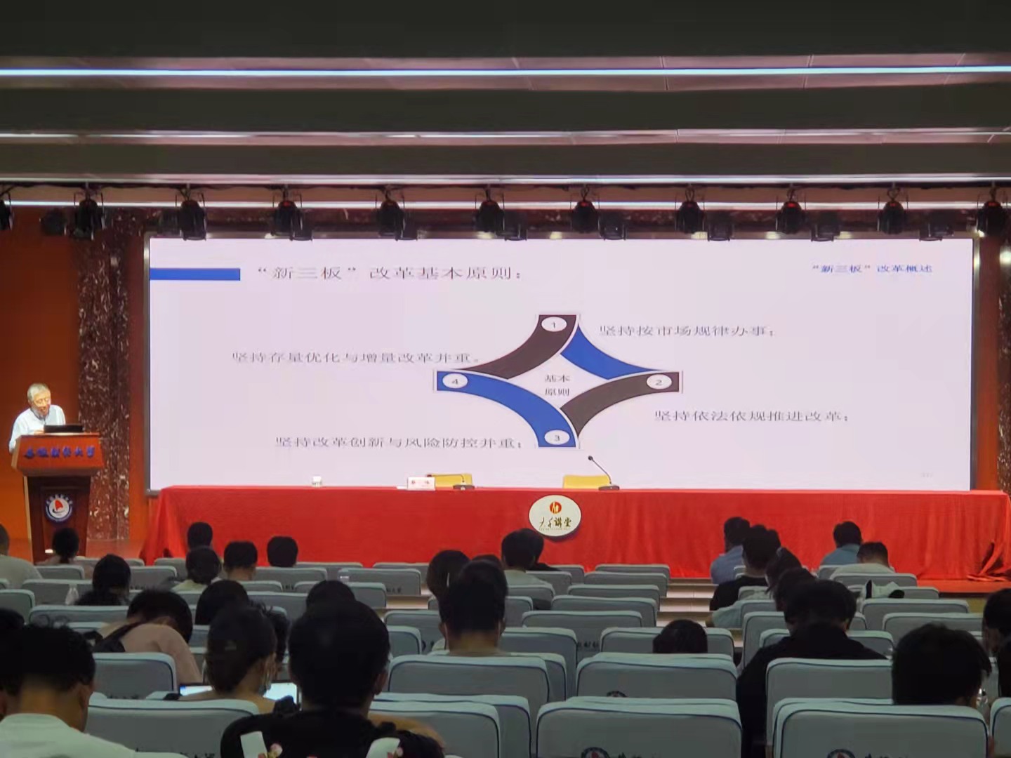 9月28日下午,“大千讲堂”第二十四讲在东校区求真楼报告厅开讲。中华全国工商联合会并购公会常务副会长、全球并购研究中心理事会副主席蔡咏作题为“立北京证券交易所与新三板改革”的报告。副校长张焕明主持报告会,各学院150余名师生聆听了报告。